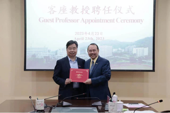 廖深基校长为阿曼教授颁发客座教授聘书。