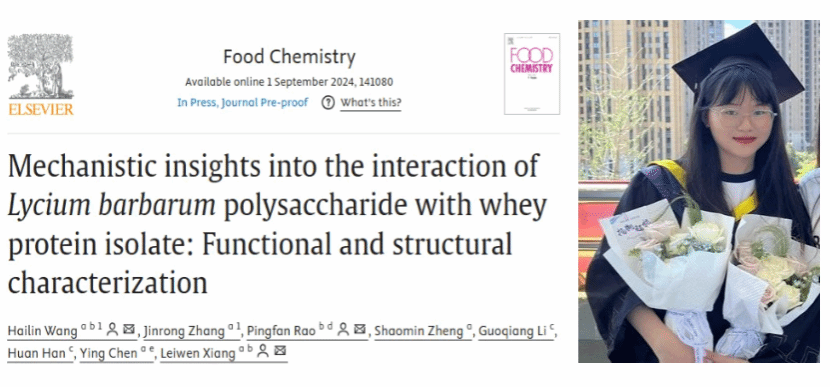 近日,我校食品与生物工程学院食品科学与工程专业2020级本科毕业生张锦蓉在校期间以共同第一作者身份撰写的论文“Mechanistic insights into the interaction of Lycium barbarum polysaccharide with whey protein isolate: Functional and structural characterization”在食品科学领域国际学术期刊《Food Chemistry》(中科院1区TOP,IF: 8.5)发表,我校为第一署名单位。这是我校首次以本科生为第一作者在国际SCI期刊上发表论文,是我校本科生人才培养质量进一步提升和学科专业建设的标志性成果。