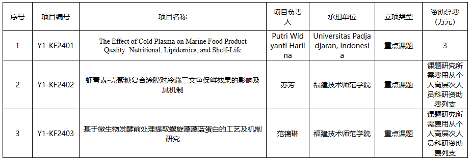 为进一步促进中外合作,提高对外交往层次和交往力度,结合省委巡视整改要求,根据《福建省-印尼海洋食品联合研发中心2024年度开放课题申报通知》精神,经个人申报、专家评审、研发中心学术委员会审定,结合学校实际,同意《The Effect of Cold Plasma on Marine Food Product Quality: Nutritional, Lipidomics, and Shelf-Life》等3个项目为福建省-印尼海洋食品联合研发中心2024年度开放课题项目,现予以公布。